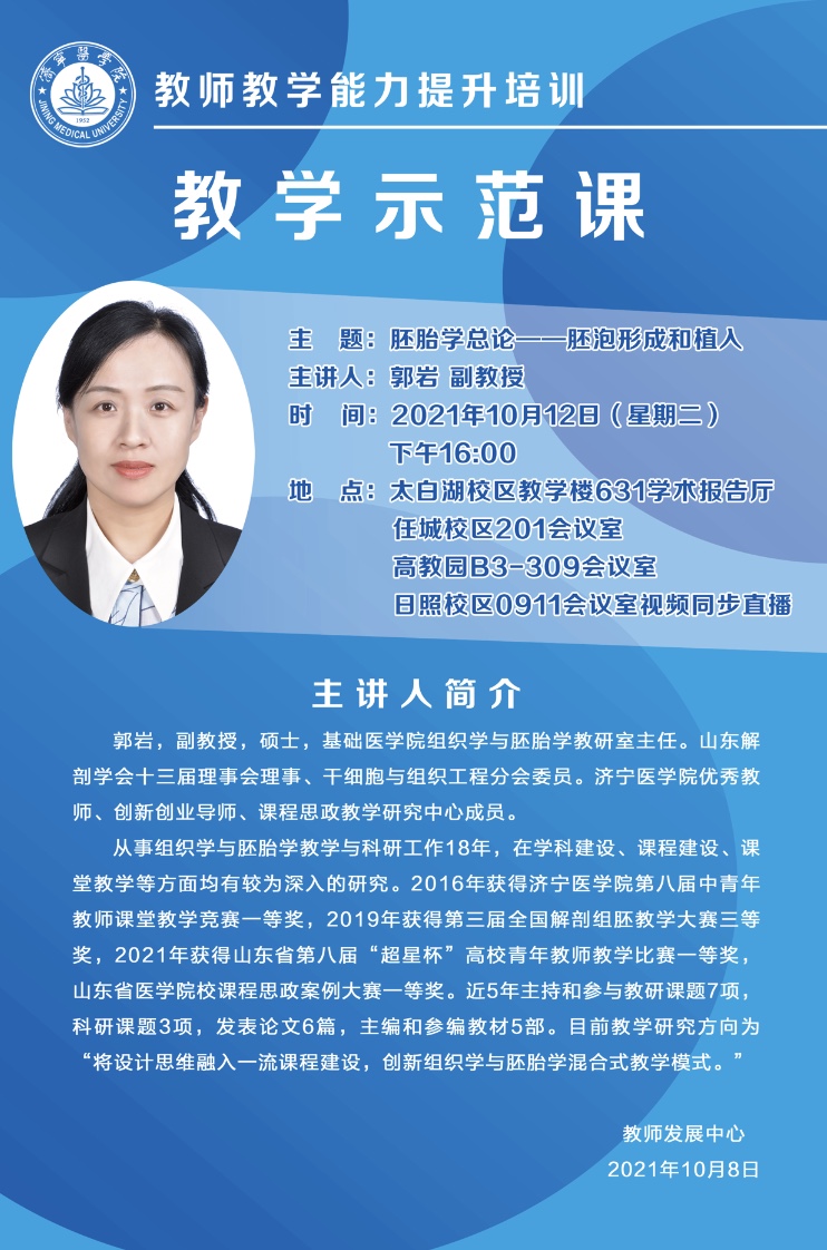 本次示范课是学校教师教学能力提升计划的重要举措之一,将计入教师培训学时。培训原则上不准请假,按照疫情防控要求全程佩戴口罩。请各学院务必组织相关人员按时参会,并将参会人员名单于10月11日上午12:00前通过OA办公系统报教师发展中心师资培训科杨森。